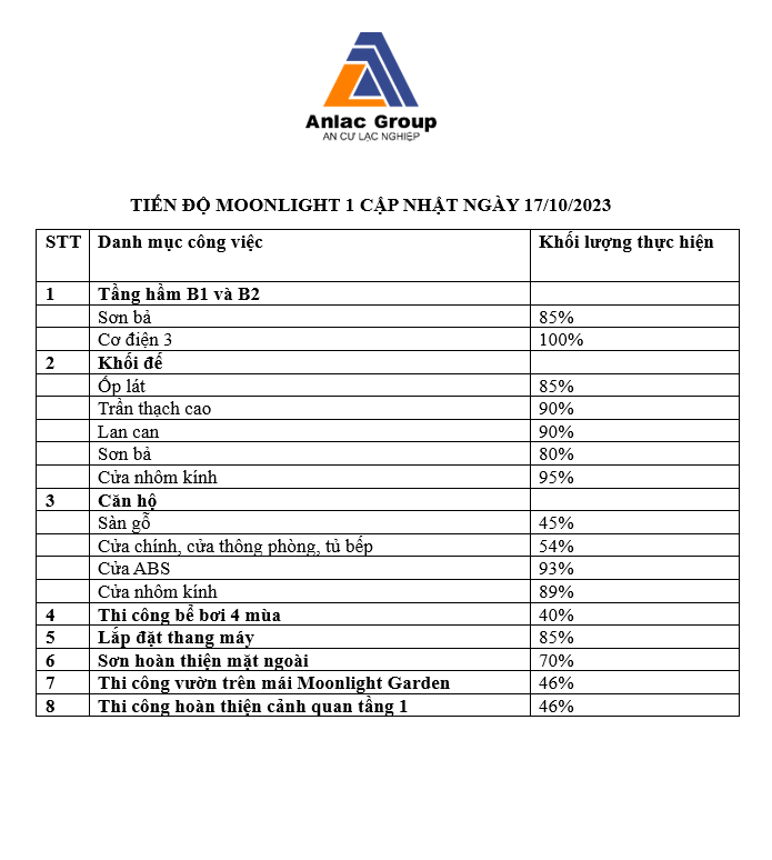 Nhằm đáp ứng sự quan tâm, mong đợi của các khách hàng và cư dân tương lai, Tập đoàn An Lạc cập nhật tiến độ Tổ hợp căn hộ Moonlight 1 cụ thể như sau:
