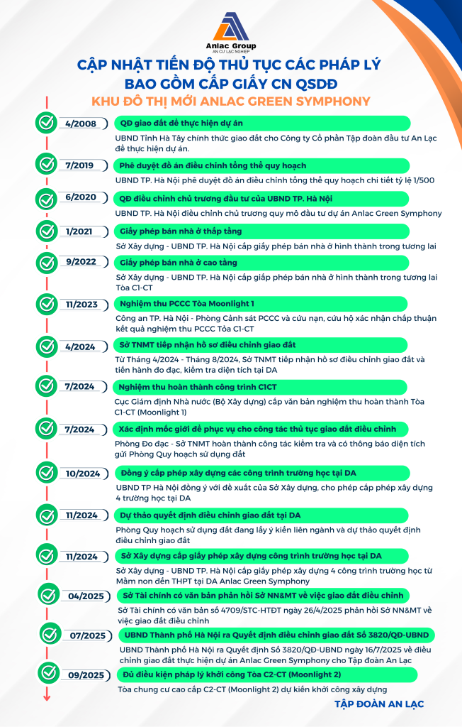 Tập đoàn An Lạc cung cấp thông tin cập nhật tiến trình thực hiện các thủ tục pháp lý đang thực hiện về dự án Khu đô thị Anlac Green Symphony Tháng 7-8/2025 như sau: