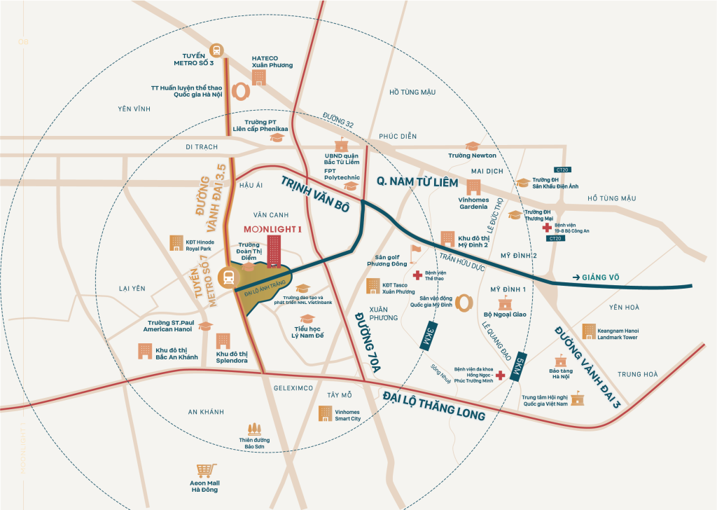 Cụ thể, từ Moonlight 1, cư dân chỉ mất 10-15 phút di chuyển tới trung tâm nội đô với tuyến đường Trịnh Văn Bô – Trần Hữu Dực – Mỹ Đình. Cũng với khoảng thời gian đó, cư dân có thể nhanh chóng kết nối tới khu vực Nam Từ Liêm, khu công nghệ cao Hòa Lạc qua đường vành đai 3.5 hoặc đường 70 tới Đại lộ Thăng Long.